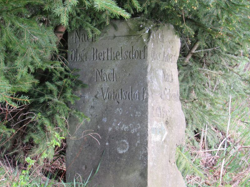 Graniczny szlak jest zapomniany - i tego dnia nie spotykam ludzi. Uchował się za to kamienny drogowskaz niemiecki: