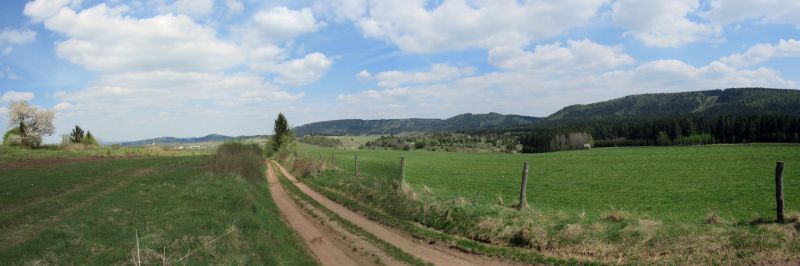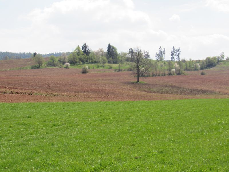 Plan obejmuje dojście na Róg, skąd roztacza się piękna panorama Kotliny Krzeszowskiej. Oczywiście aparat biorę wyłącznie dla pstrykania ptactwa, którego na łąkach (a i w lasach) nie brak. Trudno dotrzymać mi tempa z tabliczek szlakowych PTTK, bo co chwilę przystaję na fotki. Oczywiście ptaki zauważają mnie pierwszego, więc większość zdjęć - w najlepszym przypadku - to portrety ptasich zadków bądź fragmentów ogonów, podczas gdy cała reszta jest poza kadrem. Wielu, szczególnie w lesie, nie jestem w stanie dojrzeć, aczkolwiek słyszę słowiki, pierwiosnki i wiele treli, których nie jestem w stanie rozpoznać.